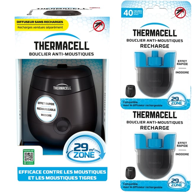 Diffuseur anti-moustiques pour l’extérieur Thermacell® : rechargeable, sans fil et inodore. Protège jusqu’à 29 m² contre les moustiques, même le tigre. Fourni avec 2 recharges pour 80 heures de protection.