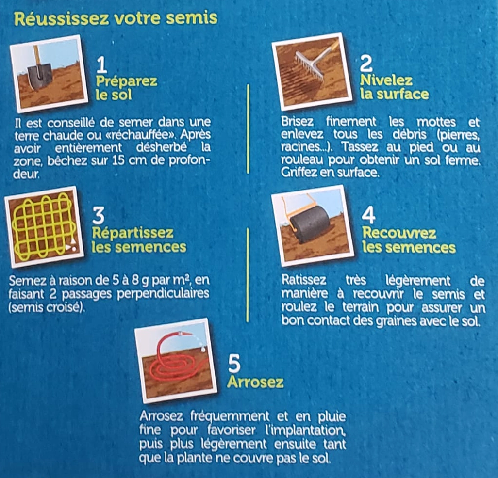 • Semez à raison de 5 à 8 g par m² en faisant 2 passages perpendiculaires (semis croisés).