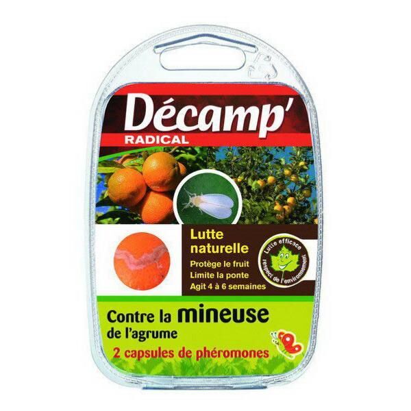 Phéromone Contre la Mineuse des Agrumes : Traitement naturel contre le papillon responsable de la mineuse (chenille) des agrumes. (Phyllocnistis citrella) En blister contenant deux caps individuelles de phéromone conditionnées en sachet étanche. Les sachets de phéromones se conservent au froid (réfrigérateur ou congélateur). Décamp Radical